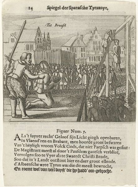 Curator: This engraving, likely produced sometime between 1618 and 1624, is titled "Wreedheden te Rotterdam, 1572", which translates to "Atrocities in Rotterdam, 1572". Editor: Goodness, it’s a rather grim scene. A chaotic dance of bodies—some upright, some… not so much. It feels staged, like a macabre theatre production, with that jeering audience of soldiers in the background. Curator: Indeed. This print, etched by an anonymous hand, offers a glimpse into the tumultuous history of the early Dutch revolt. Observe the level of detail achieved solely through the method of engraving, creating such depth with dense cross-hatching. Notice also how the violence plays out against the clean architectural lines and carefully placed figures in the composition. Editor: What I find so compelling is the stark contrast between the rigid formality of the soldiers and the messy reality of violence enacted in the foreground. The artist obviously aimed to display what the impact of such action might be on both the immediate victims and broader public society. Look at those textures. They bring you into the grit and dirt, as well as provide great technical and representational information regarding military uniforms. Curator: It certainly highlights the cold, detached efficiency of the oppressor. The print uses clear and precise linework to portray the horrors inflicted upon the citizens. The contrast between light and shadow dramatizes the scene, adding emotional intensity. Editor: Engravings like this served as a powerful tool of propaganda. Their relative ease of production meant these could quickly reach a wide audience and further enrage an oppressed people into organized revolt. It asks us to engage and confront questions of authority, obedience, and the potential consequences of conflict on human lives, both past and present. Curator: Reflecting on the print, I’m struck by how it reminds us of art's ability to both record history and shape public perception. It reminds us how violence often casts a long shadow. Editor: Yes, indeed. Beyond aesthetics, “Atrocities in Rotterdam” speaks of our intrinsic responsibility, and the powerful intersection of art and resistance to injustice.