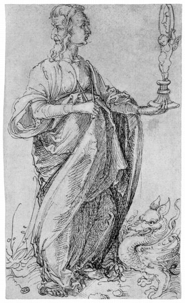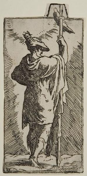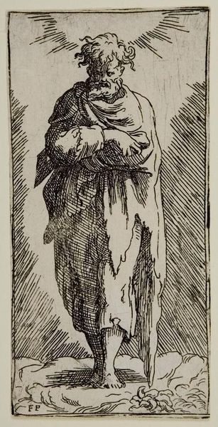 Curator: This is an etching of Saint Bartholomew, an anonymous work housed here at the Harvard Art Museums. What stands out to you? Editor: Well, immediately, the raw, almost unfinished quality catches my eye. You can really see the etched lines, the materiality of the process itself. Curator: Indeed, and that rawness lends itself to the emotional weight. Bartholomew is often depicted with his own flayed skin, a symbol of his martyrdom. Editor: Right, and here, even without that specific imagery, the tattered robe and haggard face speak to suffering and endurance. But the etching process itself… Curator: It mirrors the symbolic "tearing away," doesn’t it? The etching, like the flaying, reveals something underneath. Editor: That connection deepens my appreciation, knowing the printmaking highlights the saint’s ordeal, his labor and ours, reflected in the medium. Curator: A striking way to connect faith, suffering, and the very act of creation. Editor: Absolutely, seeing the labor makes the symbolism even more profound.