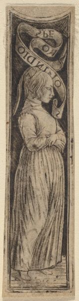 Jan Kobell II created this drawing of a standing woman with a basket using pen in brown. The composition focuses on the figure's back, her form constructed with subtle tonal variations, a series of delicate strokes creating depth and volume. Light and shadow play across her clothing, and the texture of the woven basket contrasts with the smooth surface of the jug she carries. This interplay creates a visual rhythm that invites the eye to explore the details. Kobell's choice to depict the woman from behind invites us to consider the gaze, and the power dynamics inherent in how subjects are viewed. By denying us a direct look, he destabilizes the traditional relationship between viewer and subject, prompting questions about the act of observation itself. The woman becomes an object of study. Through his meticulous approach, Kobell uses formal elements to explore themes of representation and the nature of seeing. The artwork functions not just aesthetically, but also as part of a larger cultural and philosophical discourse.