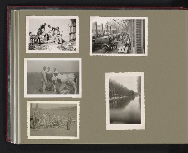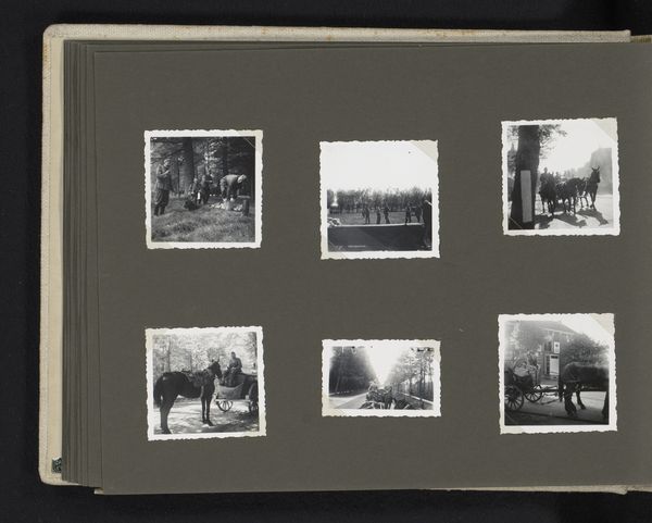 Editor: This is *Opmars*, a photomontage, a gelatin-silver print made anonymously between 1940 and 1945, now held at the Rijksmuseum. It looks like a photo album page. It's mostly in grayscale, giving a really somber mood. What do you see in this work? Curator: What immediately strikes me is how this album format reframes notions of collective memory and wartime experiences. The artist utilizes photomontage in such a poignant way; the composition choices disrupt traditional historical narratives by presenting fractured perspectives. Notice the recurring imagery; how are vehicles positioned in the scenes? Editor: They're… either broken down or driving towards something… an event perhaps? Curator: Precisely. And what do these potentially destructive yet ubiquitous technologies imply about power, gender and identity within wartime society? Consider that anonymity itself could be an active statement, a commentary, especially amidst a conflict demanding so much visibility and control. How do you see these individual pieces forming a collective whole and, perhaps, conveying meaning? Editor: Maybe each photo captures a fragmented experience of people involved in or affected by the conflict? It is the uncelebrated experiences, making it a statement against dominant wartime narratives. Curator: Indeed. It serves as a stark reminder to resist simple narratives and explore how power and societal structures influence individual experiences during upheaval. What will you carry from our conversation today? Editor: I will consider how even personal and anonymized collections like this provide really crucial insight into people's experiences during large historical events.