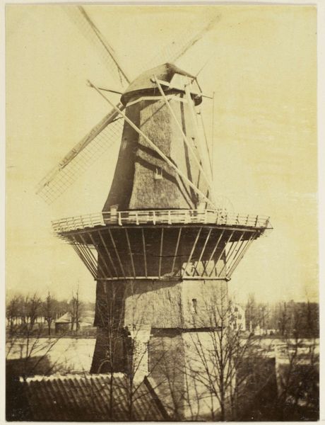 This is a stereoscopic photograph of a windmill on Tempelhofer Berg in Berlin, created by Johann Friedrich Stiehm. The composition is dominated by the windmill, its geometric form and strong diagonals of the sails creating a striking contrast against the flat landscape. The image uses a sepia tone, which evokes a sense of nostalgia. Looking closely, the symmetrical structure and precise angles suggest an interest in order and clarity. The windmill itself acts as a signifier of rural industry, set against the backdrop of what appears to be early industrial development. This visual juxtaposition invites us to consider the evolving cultural landscape of 19th-century Germany, reflecting a society in transition. The stereoscopic format adds another layer, suggesting a desire to capture not just an image but an experience, playing with depth and perception. The formal elements work together to create a dialogue about progress, tradition, and how we perceive the spaces around us.