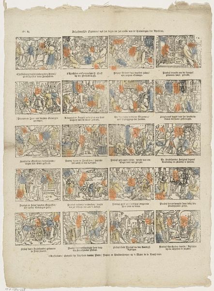 Curator: Here at the Rijksmuseum, we have a rather intriguing print from between 1800 and 1833 entitled "Driekoningenbriefjes," created by Philippus Jacobus Brepols. It's a fascinating example of early 19th-century graphic art. What catches your eye initially? Editor: Well, looking at this overall composition, I am immediately struck by how it feels like a satirical game board populated by Dutch proverbs and occupational hazards, maybe a touch fatalistic? Each little scene seems to tell a different story in miniature. Curator: Indeed! The work consists of numerous small, framed scenes, each depicting a different character or profession. We see occupations like 'the herring seller', 'the baker', but also archetypes like 'the singer' and 'the jester.' Editor: So, a collection of archetypes represented with engravings. What intrigues me is the potential for a socio-political reading. These were tumultuous times and these "little pictures" or professions, as a complete chart, probably mirrored the contemporary Dutch class struggles and working-class experience...perhaps a coded commentary on early capitalism. Curator: That's an interesting read of this piece. Each little square contains not only an image but a short verse too. So there is this added layer of narration through this early use of word and image association that one can interpret in different ways depending on their vantage. Editor: And that word and image pairing, crucial to unpack! It’s where ideology hides. Look at “The King" at the top left; notice how he literally looks caged up? Early commentary on royal excess. Each figure seems caught in a performative role—forced to uphold their status... like the "musterd man." Even though these roles look mundane, they actually unveil historical inequalities that affect access to resources. Who controls labor? How does it happen and what does it produce? Curator: So looking at the print through that lens...we are left to consider who holds power, and how did labor distribution and class roles at that moment define society. This also suggests to us, given the gameboard layout, this print also was intended for game playing as a fun but also quite meaningful family pastime. Editor: Exactly! These seemingly innocuous images hold up a mirror to social norms and ask some uncomfortable questions about who we are as a society. Curator: Definitely some thought to ponder! A snapshot from a long while ago… mirroring society still!