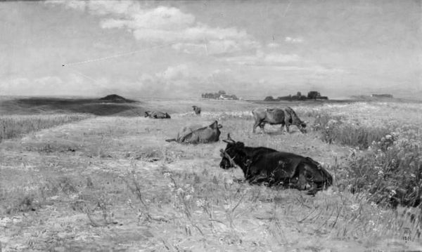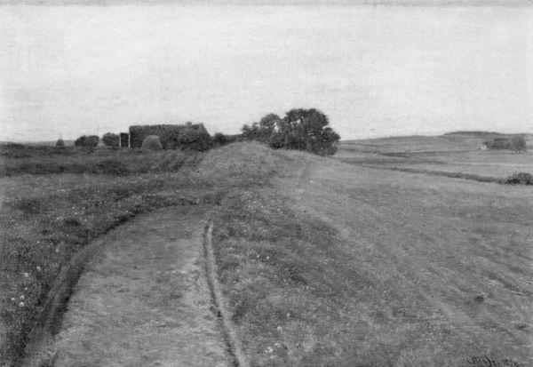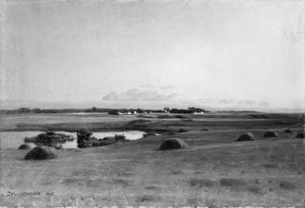 Editor: This is "Autumn Day," a charcoal and pencil drawing created in 1902 by Carl Wilhelmson. The countryside scene has a very serene feel. How do you interpret this work, especially considering its historical context? Curator: Looking at Wilhelmson's "Autumn Day," I am immediately drawn to its representation of rural life, not simply as a picturesque scene, but as a commentary on land, labor, and the changing relationship between humans and nature in the early 20th century. What do you observe about the human presence in this landscape? Editor: Well, it's interesting; it's there in the form of the grazing cows and suggestion of the farm buildings in the distance. But overall, I find its depiction is so subdued and unobtrusive. It is almost a nostalgic look at the land. Curator: Exactly. Consider the broader socio-political context. The early 1900s were a time of rapid industrialization and urbanization. For Wilhelmson, as for many artists, representing the rural could be read as a political act—a form of resistance against the alienation caused by modernity and potentially a symbolic upholding of tradition. Does the medium, charcoal, perhaps play a role in this impression? Editor: Yes, I see that. The monochromatic tones and the texture add to that feeling of historical weight. It's not just a depiction of the countryside, it's a statement about it. Curator: Precisely. And this subdued palette may lead us to consider the artist's intentions about his subjects. He chose charcoal as a very conscious act. The very dark hues that charcoal creates have very different symbolic weight than any other medium. We may assume, therefore, that he had some deliberate meaning in mind when executing "Autumn Day". So, what resonates most with you now after this deeper dive? Editor: I think I'm seeing how an image, seemingly simple on the surface, can carry layers of meaning related to societal shifts and cultural values of its time. Curator: Indeed. It becomes an invitation to reflect on our own relationship with the land today, our history and where we are headed.