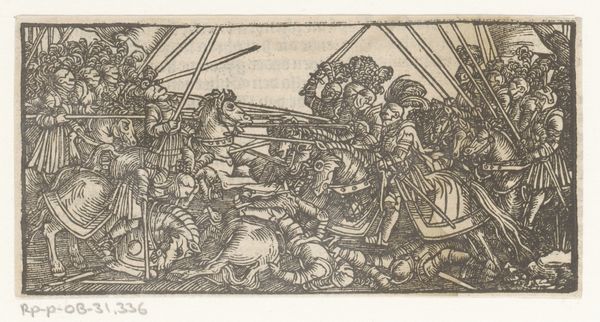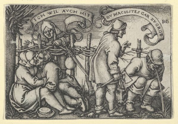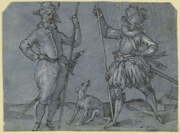 Editor: This is "Three German Soldiers Armed with Halberds," an engraving by Daniel Hopfer from around 1510. There's a palpable sense of masculinity and power here, emphasized by the soldiers' imposing armour and weaponry. How do you interpret this work within its historical context? Curator: What I see is an intentional assertion of identity tied directly to political power. Consider the rise of German nationalism at the time. How does this image, with its carefully rendered figures and their assertive stance, function within a visual rhetoric promoting German strength? Think about the function of representing a unified national image in early 16th century Europe. Editor: So you're saying this image does more than just depict soldiers; it contributes to the very idea of a unified "Germany" as a force to be reckoned with? Curator: Precisely! Look closely at their garb, the halberds they carry. Are they just tools of war or symbols of status, power, and German prowess? What stories about German identity might such powerful visual cues transmit? These weren't just any soldiers; they were meant to embody an ideal, a concept of "Germanness" worth fighting for, but also one imposed by certain powerful interests and at the exclusion of other marginalized groups. Editor: I hadn’t considered how constructed this image is as an assertion of power. The inclusion of a dog even contributes to the display of military readiness and wealth, which underscores control. Curator: Exactly! And isn’t that fascinating, the deliberate way in which identity, power, and nationhood intertwine within art? Now, consider who the intended audience might have been. What purpose did this image serve beyond simple decoration? Editor: This makes me rethink how seemingly straightforward depictions can be incredibly layered and potent expressions of political will and cultural narratives. Thank you! Curator: Indeed. It serves as a potent reminder that art is always engaged in dialogues far beyond aesthetics.