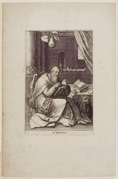 Curator: Here we have Richard Collin's "Belisarius," an engraving dating from 1675 to 1680. It resides here at the Rijksmuseum. Editor: The desolation conveyed is striking; the lines create a deeply melancholic atmosphere. There is a palpable sense of loss about this figure. Curator: Precisely. Collin masterfully employs light and shadow, observe the tenebrism—to emphasize the figure's emotional state. His precise, controlled lines articulate the texture of the garments and the rough-hewn stone around Belisarius. This is neoclassical, wouldn't you agree, in its idealisation of form? Editor: From a material perspective, let’s consider the act of engraving itself. The sheer labor involved, meticulously carving those fine lines into a metal plate. The process is indirect; a mediation between the artist’s vision and the final print, revealing both control and constraint within the system of production and reproduction of images. Curator: A very important consideration. What's particularly engaging here, as a history painting, is how Collin uses a print medium, to depict a classical subject—Belisarius—the celebrated Byzantine general, now reduced to poverty and blindness as the story tells it. Editor: The visual narrative hinges on that staff he holds. A tactile object representing Belisarius's dependency, the wood speaks of simple needs, labor, but also abandonment— contrasting starkly with his previous status as a military leader. His worn sandals speak also about decline. The act of producing and circulating images like this serves to solidify not only his fall but the value and purpose that art plays in cementing cultural memory and disseminating lessons about power and hubris. Curator: An incisive reading. The semiotics of poverty are very thoughtfully expressed here. The careful modelling of the figure certainly elevates Collin's engraving. We observe how historical subjects offer endless interpretation in art. Editor: Ultimately, a detailed, yet bleak artwork about the inherent contradictions within the experience of labour and power.