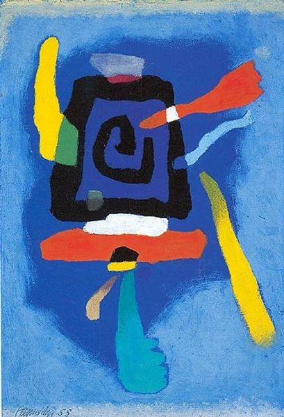 Curator: Welcome. Before us is an untitled acrylic painting from 1947 by Adolf Fleischmann. It immediately strikes me as quite dynamic. The bold use of color is hard to ignore. Editor: Yes, the visual temperature is decidedly hot. A predominantly red ground overlaid with strong, graphic lines in contrasting yellow, blue, and white—a real chromatic intensity. Curator: Absolutely. Fleischmann's exploration of form here speaks to the postwar fascination with abstract expressionism. But beneath the pure formalism, I sense deeper symbolic echoes. Editor: Such as? While I see the echoes of abstract expressionism in the boldness, what intrigues me most is the structural play between these somewhat geometric and biomorphic shapes, the interplay of figure and ground, creating a sense of almost floating forms. Curator: Perhaps the looping lines suggest cycles of life and death, and the dark void in the lower right corner reminds me of a seed waiting to sprout or, in its darker reading, existential emptiness after the devastation of WWII. I mean, a stark void is so central. Editor: A potent reading. However, one can also approach the void purely structurally: it acts as an anchor, a counterweight to the energetic movement of the lines and shapes. It consolidates the visual construction of the work. Curator: I don't discount that at all. Even those outlined shapes… reminiscent of primitive masks perhaps? Or perhaps the abstracted human form undergoing transformation after immense changes on society as a whole? These elements seem rooted in cultural archetypes. Editor: Or perhaps Fleischmann’s emphasis on flat color planes and strong contour lines echoes, and pre-dates, what would soon develop into the Pop Art movement! There's also an undeniable decorative element here—a joyful dance between line and colour that lifts the work beyond mere symbolic representation. Curator: Right—it is an invitation for us to feel and interpret as much as to analyze and categorize, revealing just how complex something that feels visually very simple can truly be. Editor: I agree; the seeming simplicity makes room for so many readings of structure and emotional register alike.