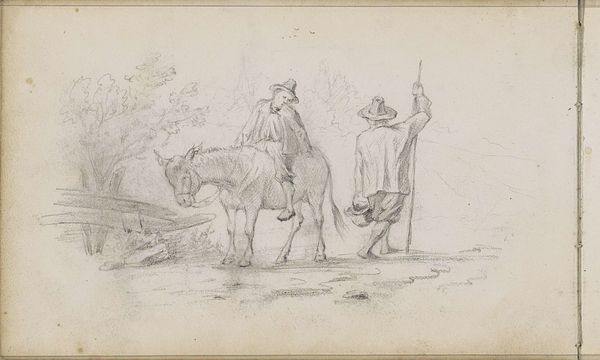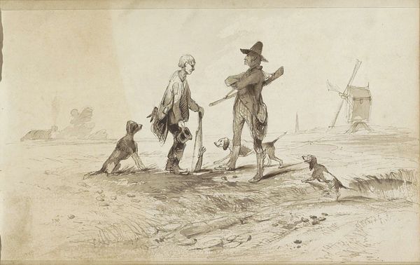 This landscape, featuring a hunter with dogs and a distant windmill, was created by Johannes Tavenraat using graphite on paper. The sketch is light and airy, achieved through quick, thin lines that suggest form and movement without heavy shading. Graphite, a form of carbon, allows for a wide range of tonal values and textures, making it ideal for preliminary sketches and studies. Tavenraat uses this material to capture a fleeting moment in the Dutch countryside, focusing on the interaction between the hunter and his dogs. The lines appear spontaneous, almost as if sketched on the spot, with minimal reworking. The composition is simple, yet it conveys a sense of depth and space. The windmill in the background indicates the influence of human activity on the landscape, while the hunter and his dogs represent a traditional rural pursuit, a leisure activity. This drawing prompts us to consider the relationship between humans and nature, and the ways in which artistic materials like graphite can capture the essence of a place and time. It is a reminder that even a simple sketch can convey complex ideas about society and the environment.