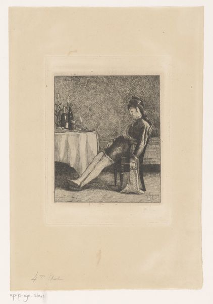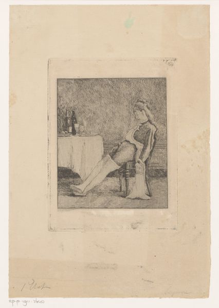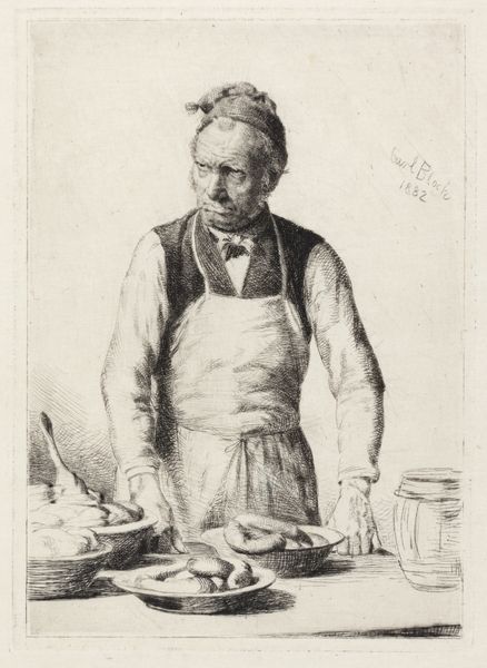 Carl Bloch created this image, Worstmaker, using etching, in 1882. The composition immediately draws your eye to the figure's direct gaze. This, combined with the symmetry in the apron and waistcoat, gives him a sense of balance. A muted palette creates an intimate atmosphere, drawing us into the ordinariness of this man's world. Note how the cross-hatching of the etching technique defines form and texture, from the soft cap to the smooth plates. The use of hatching also adds depth, creating shadows that sculpt the figure. The perspective, with the table cutting across the foreground, gives the composition a dynamic tension, as if we are part of the scene. In semiotic terms, the image is a signifier of everyday life. The uniform signifies labor, the food on the table domesticity. These signs work together to evoke a sense of the individual's place in a larger societal framework. The careful attention to form invites us to contemplate the meaning of work, value, and representation. These interpretations can shift over time, reflecting changing societal values.