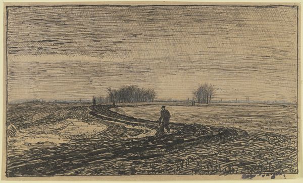 Editor: We're looking at "Milcendeau's House at Bois Durand," created around 1915 by Charles Milcendeau, using watercolor and colored pencil. The first thing that strikes me is its quiet melancholy, that sort of brown-gray dominating the landscape... What do you see in this piece? Curator: Oh, it whispers of bygone eras, doesn't it? This is a lovely tableau! Imagine Milcendeau, stepping out perhaps from the very house he depicts – can't you almost smell the damp earth and woodsmoke? Look at the economy of the lines, the way he suggests so much with so little… And those figures, almost ghost-like, part of the scenery yet somehow detached. Do you see how he's used light to suggest depth, almost like memory playing tricks? Editor: Definitely a feeling of fading memory...The light almost blurs everything. Do you think that reflects anything specific about that time, 1915? Curator: Absolutely! Remember, 1915 was a year deeply etched by the Great War. It’s easy to imagine that shadow falling across the house and field, reflecting something beyond the landscape. The mundane tasks depicted carry a quiet tension, right? Art often hints, suggests… sometimes the beauty resides in that delicate suggestion, not an overt statement. What do you think he's telling us with this reticence? Editor: It makes me think of how life keeps going on even during tragic times. I appreciate that the beauty in art sometimes lies in what's unsaid, the subtleties you pick up on after longer, deeper looking. Curator: Precisely! Perhaps we've uncovered some hidden treasure together today then? Editor: For sure, I learned a new perspective today. Thank you.