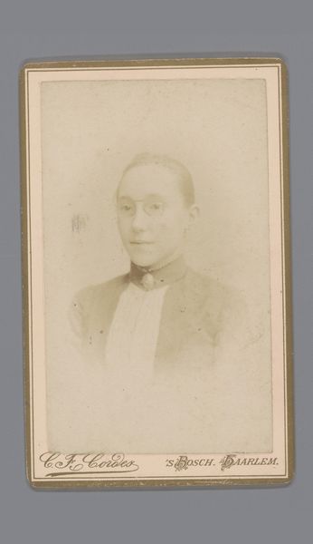 Editor: Here we have "Portret van een man met snor" - Portrait of a Man with a Mustache, a photo likely taken between 1895 and 1920 by Carl Sandels. It's very faded, ghostly almost. The way he's looking slightly off to the side makes me wonder what he’s thinking. What's your impression of this image? Curator: Oh, he’s staring just past us, into a different century, isn't he? This is like stumbling on a half-forgotten dream. I see the meticulous detail given to his moustache, it almost dances on his upper lip. But it is the framing, isn't it, that tells a richer story. The simple decorative border almost turns this photograph into a keepsake. Editor: A keepsake... yes, I see what you mean! It looks like it was maybe part of an old photo album. Curator: Precisely! These kinds of portraits, reproduced and framed, were not uncommon. This photograph captures a specific period fascination with portraiture as both memento and social marker. Do you see the almost theatrical lighting, the gentle gradations of tone that almost makes the image seems to fade at the borders? He wants us to be transfixed not just by the subject, but also the moment captured. A gentle reminder that everything, even meticulously documented portraits, can fade with time. What does that say about his enduring mark on our world, or even just in the world of his loved ones? Editor: That's such an interesting point! I was focused on the fading, the literal loss of detail. I hadn't considered what that communicates metaphorically, that makes you wonder what the world around him was like back then... and about what happened after. Curator: It's the beautiful paradox of old photographs, isn't it? They speak volumes, even in their silence.
