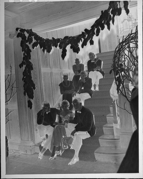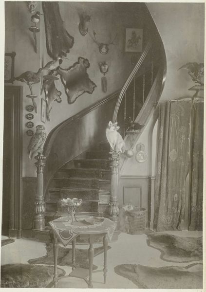 Curator: Looking at "Untitled (flower girls on staircase)" by Martin Schweig, I'm immediately struck by the stark contrast and the way the patterned wallpaper almost overwhelms the subjects. Editor: Yes, the material qualities of the photograph—the paper itself, the developer used—create a sense of aged elegance, almost like a relic. But the wallpaper points to larger trends of domesticity and interior design. Curator: Precisely! The labor involved in creating and maintaining such a space speaks volumes about class and gender roles. It makes me wonder about the social circumstances of the girls. Editor: Indeed. Flower girls often symbolize purity and new beginnings in weddings, and this photo could be read as an exploration of these cultural expectations. The image itself becomes a commentary on those traditions. Curator: I see it more as a study in constructed innocence and the material trappings of childhood, how their attire reflects a performance of social norms. Editor: And what a performance it is, staged within the frame of broader societal expectations. Curator: It leaves you with a lot to consider about the manufacturing of innocence and the socioeconomic factors at play. Editor: It truly does provide a glimpse into how photographs both reflect and shape social norms.