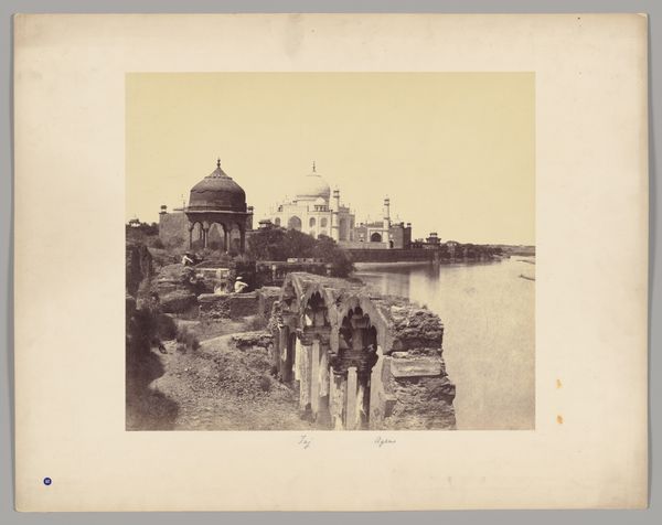 Editor: So here we have John Murray's "Taj Mahal from the East," an albumen print dating from about 1858 to 1862. What strikes me is the contrast. You have this stunning, iconic monument, but it's framed by what looks like ruins, or perhaps just very unkempt landscaping. How do you interpret this work? Curator: The ruins framing the Taj are important. This albumen print, with its specific chemical processes and the labor involved in its creation, gives us a window into colonial-era India. Note the material reality of the scene – the decaying structures versus the pristine mausoleum. Editor: Are you suggesting it is intentional, contrasting the idealized with the actual? Curator: Precisely. The photograph becomes an object laden with cultural baggage. Think about the consumption of such images by a Western audience. What desires are being catered to through this staged view? Is it really about representing the Mughal achievement, or more about highlighting a certain perspective on British authority and Indian "decay"? Editor: So it's not just a pretty picture, but a statement about power dynamics encoded in material form? Curator: Absolutely. Even the choice of photographic materials speaks to the era’s technological advancements and the accessibility, or lack thereof, for local Indian artists at the time. Who owned the means of production here? Who was able to control the narrative and the means for its dissemination? Editor: That's fascinating. I had just assumed it was a simple landscape shot. Curator: It pushes us to examine photography not just as a record, but as a crafted object embedded within its social and economic context. The Taj is eternal, but the method, material, and labor involved reveal far more than just the building itself. Editor: I'll definitely think about photographs differently from now on.