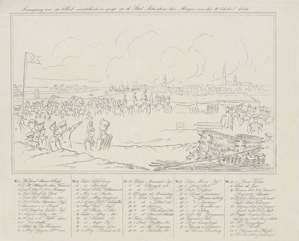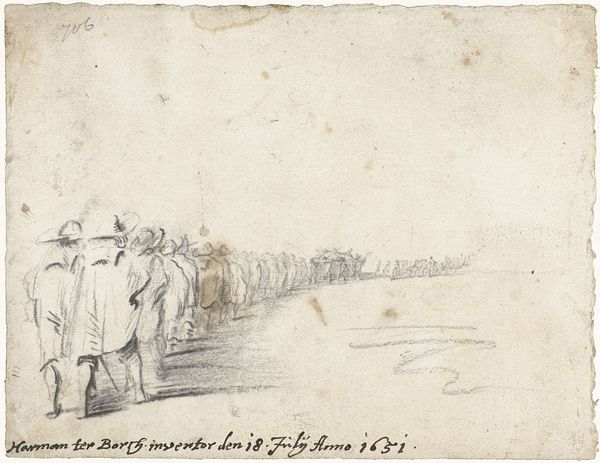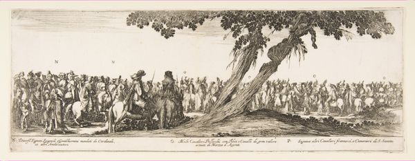 Editor: This is Stefano della Bella's "Entrance of the Polish Legation into Rome," from 1633. It’s an etching, full of such incredibly fine lines! The whole scene feels like a memory being meticulously recorded. How do you interpret this work, with its sense of both grandeur and almost fragile detail? Curator: It’s fascinating how della Bella uses that delicate medium to depict a scene laden with symbolic weight. Consider the 'entrance' itself - entries are pivotal moments. Think of it as a ritual performance: The Polish legation isn't simply arriving; they're *entering* Rome, a city pregnant with history and spiritual power. The very act of entering carries connotations of respect, negotiation, and the claiming of a place within a pre-existing symbolic order. Look at how the figures are arranged: does it evoke any familiar imagery or narrative structures for you? Editor: I see...it’s like a procession, almost biblical? Are you saying the artist intended for us to view this political event through a lens of almost religious importance? Curator: Precisely. This entrance, documented so meticulously, uses visual symbols – horses, robes, the very composition of the crowd – to suggest legitimacy and even divine favor. Notice how this "event" translates into political "currency". The artist, knowingly or unknowingly, invokes history to shape how we perceive these figures, creating a narrative not just of arrival but of integration and perhaps, aspiration. Consider then the nature of history painting as the artist conceives it. Editor: So it’s not just about what happened, but what the artist wants us to believe happened, and what that means symbolically. It's like they’re etching a version of history itself. Thanks for unlocking this work; I see how the images hold so much cultural memory. Curator: And memory, as always, is actively constructed, visually performed and culturally remembered.