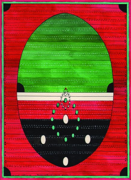 Oleksandr Aksinin made this small painting, Clown Dance, using watercolour and ink to create a grid of bizarre images. The colours are bright, but muddied, like old circus posters, with the confident lines of an architectural plan overlaid on top. I like how Aksinin embraces the slightly awkward and amateurish nature of the medium. Take the image in the centre: a green-faced clown with bulging biceps wearing a red cummerbund and an expression that could either be smiling or grimacing. The thick black outlines and the flat colour give it a cartoonish feel, but the strange details – are those tattoos on his arms? And what's with the floating red disc? – elevate it to something more unsettling. It reminds me of Philip Guston's later work – that same willingness to embrace the crude and the ugly, to create images that are both funny and deeply disturbing. Art is a conversation, after all, a way of talking to each other across time and space through marks and gestures. In this painting, Aksinin invites us to join the conversation, to bring our own interpretations and find our own meaning in his strange and wonderful world.
