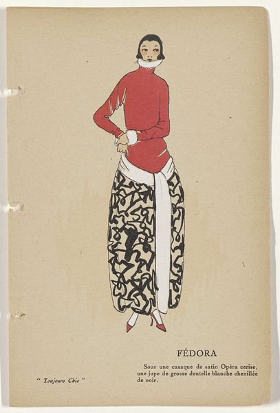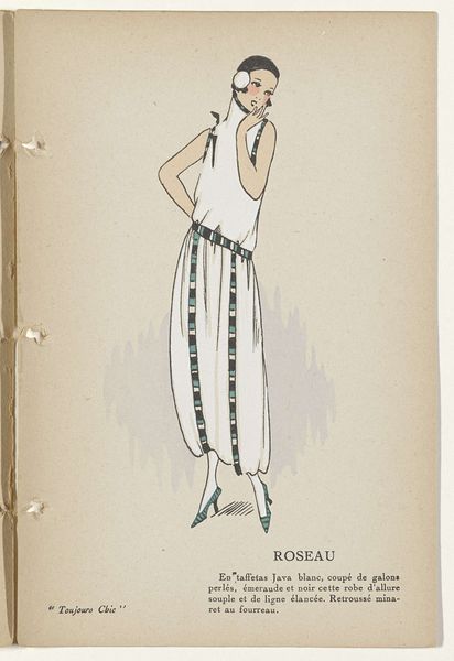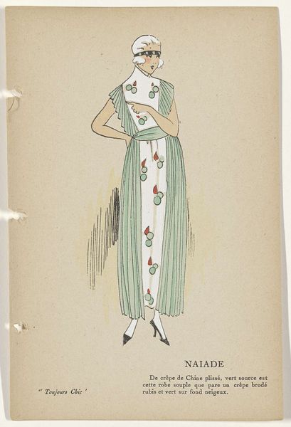 Editor: Here we have "Toujours Chic Les Robes, Hiver 1921-1922: Marquise," created sometime between 1921 and 1922 by G-P. Joumard. It's a drawing with ink and watercolor that looks like a fashion plate. I find the colour palette muted, which really gives it that historical feel, but how does this drawing resonate within its cultural moment? Curator: That’s a great question. Considering the period, the illustration emerges from the tail end of the Art Nouveau movement and right into the burgeoning Art Deco era. Can you see how it sits at the cusp, retaining the flowing lines of Art Nouveau while embracing a more simplified, geometric sensibility? Editor: Yes, definitely. You can see it in the dress patterns. So, this wasn't just a depiction of clothing; it had a bigger role in society? Curator: Absolutely. These fashion plates served as a crucial form of visual communication. In an era before mass photography and widespread visual media, they informed and shaped the desires and aspirations of a growing consumer culture. Think about it: this image promotes not only a style, but an entire lifestyle, projecting ideals of feminine beauty and social status. It was very much about exclusivity and taste. Editor: That makes me wonder, were these designs truly accessible, or were they meant for a very select audience? Curator: That's the crux of the issue. While seemingly democratic as a visual medium, these illustrations primarily catered to the haute bourgeoisie. Consider the social and economic stratification of the time; the clothes represented here would be unattainable for most women. In what way does this visual strategy influence viewers? Editor: I see, so these images, while beautiful, reinforced existing social hierarchies by promoting an exclusive and often unattainable image. I hadn't thought about it that way. Thank you! Curator: Precisely! Reflecting on the interplay between art, commerce, and societal structures really opens up how we view historical works like this.
