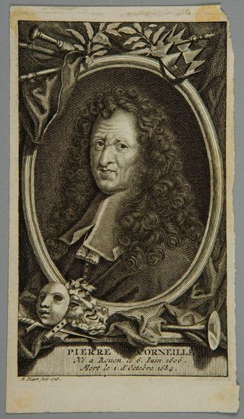 Curator: This engraving of Antoine Coysevox by Jean Audran presents some interesting questions about artistic labor in the 18th century. Look at the detail in the tools depicted. Editor: Indeed! I'm fascinated by how Audran chose to represent Coysevox, not just as an artist, but with such prominent display of his tools. What does the inclusion of these tools suggest about the value placed on the craft itself? Curator: It highlights the means of production. Audran isn't just portraying Coysevox's artistry, but subtly drawing attention to the act of creation, and the materials involved in it. It makes one consider the socio-economic context of artistic production at that time. Editor: So, it's not just about the finished sculpture, but the whole process, the materials, and even the social status of the artist and engraver? I'll definitely look at prints differently now!