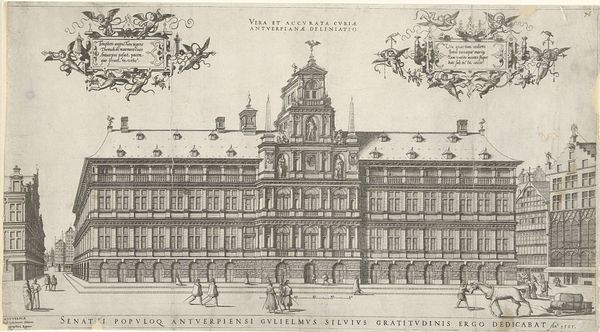 This pen and gray ink drawing depicts the front view of Amsterdam's Town Hall. The building's design prominently features a symmetrical facade, crowned by a central dome and adorned with classical figures. The dome, topped with a celestial figure, resonates with ancient symbols of power and divine authority. Such figures atop structures echo those found in classical antiquity, symbolizing a connection between earthly governance and the heavens. The continuous presence of classical motifs reflects a deep-seated human need to legitimize authority through historical and mythical connections. Consider how these motifs reappear throughout history in royal and state buildings, each time adapting to reflect contemporary values, yet still carrying echoes of their origins. As we reflect on the powerful symbols of the Town Hall, we acknowledge the cyclical journey of cultural symbols, continually evolving and resurfacing to reflect and shape our collective consciousness.