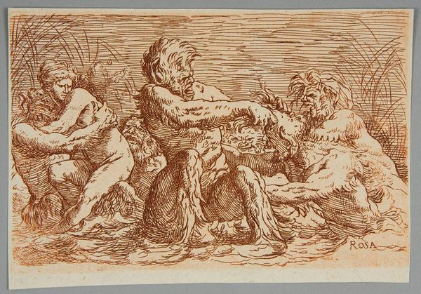 Curator: Here we have Salvator Rosa's "Combat of Tritons," currently residing at the Harvard Art Museums. It presents a chaotic scene, doesn't it? Editor: Chaotic is an understatement! It's like peering into some feverish, aquatic dream, all swirling lines and monstrous faces. Curator: Rosa, active in 17th century Italy, often explored themes of violence and the sublime. The printmaking process itself—etching—allowed for these wild, dynamic compositions. Editor: There’s a raw energy in the marks, an almost visceral feeling of struggle. I can almost feel the salty spray and hear the guttural roars of these mythical beasts. Curator: Consider the socioeconomic implications—prints like these democratized art, making Rosa's dramatic visions accessible beyond elite circles. Editor: Yes, and within that democratized space, Rosa offers us a glimpse into his own tempestuous imagination. It makes me wonder what was going on in his life to channel all this drama! Curator: Indeed. It's a compelling look at art, society, and the artist's own hand in shaping both. Editor: Absolutely. A truly captivating piece.