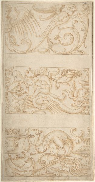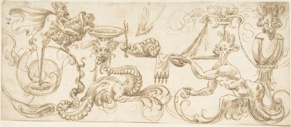 Editor: This drawing, "Flemish Grotesque Creatures and a Candelabra Grotesque" from the 16th century, showcases a series of fantastical creatures rendered in ink. I'm struck by the sheer inventiveness and detail in these hybrid forms, but also the clear compositional structure of the sheet. What do you see in this piece, considering its formal qualities? Curator: Formally, the emphasis on line is paramount. Note how the artist utilizes varied line weights to define form and create depth. Observe the intricate cross-hatching employed to model the creatures, juxtaposed with the delicate, almost skeletal, outlines of the candelabra. Do you notice the structural interplay between organic and geometric motifs? Editor: Yes, the spiral forms of the shells echo in the floral and ornamental elements. Is the relationship just decorative, or does it play on tensions and harmonies? Curator: Precisely. The tension arises from the contrasting textures – the rough, naturalistic depiction of the creatures versus the smoother, more stylized candelabra. Yet, the harmony stems from the overall balance in composition and the consistent application of line throughout. Furthermore, one may read the grotesque figures as a dynamic element offset by the relative stasis of the architectural motifs of the candelabra. Editor: So the grotesque becomes not just about oddity, but about activating the entire surface through contrast? Curator: Exactly. The artwork challenges us to consider how opposing elements—the grotesque and the ornamental—can coexist within a structured visual framework. Note, however, how the medium and structure produce the affect – how the formal decisions of the artist underpin its cultural position. Editor: It's amazing how much complexity comes through even in a relatively simple medium like ink on paper. Thank you for sharing your expertise. Curator: My pleasure. Examining the formal qualities reveals a deeper appreciation for the artist’s skill and the work’s enduring visual power.