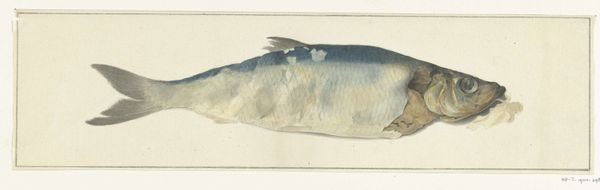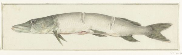 Curator: Allow me to introduce you to "Snoek," a drawing possibly from 1796, residing here at the Rijksmuseum, rendered in ink, pencil, and wash on paper by Jean Bernard. Editor: Oh, it's so restrained. A rather melancholic fish floating in a sea of nothingness, all gentle greens and grays. Very polite for a predator, don't you think? Curator: Its politeness is precisely its strength! Bernard employs naturalism to create almost a scientific document. Consider the precise delineation of the scales, the fin structure. It adheres to a classical aesthetic of detailed observation. Editor: Documentarian, yes, but where’s the drama? Give me a churning sea, a hook, even a menacing fisherman! Instead, we get… taxonomy. I miss an undercurrent of danger. I'm sure this fish knew something of hunger, of fear! Curator: Indeed, one might read its isolated presentation as symbolic of humanity's detached, categorizing gaze upon the natural world. Its very stillness speaks volumes about imposed order. Editor: Hmmm, fair point, its static nature certainly amplifies a desire for motion, a splash, something to shatter the composition. All those parallel stripes lend a strange stillness to the piece, locking it down, somehow. Curator: Those very stripes could be read as bars, metaphorical constraints imposed upon the animal, eh? Bernard has composed this to more than be simply an image of a fish; it's a meditation of man versus nature. Editor: Still, I wonder… was old Bernard hungry when he drew this? Maybe the flat background represents the emptiness in his stomach! See, sometimes even formal lines and shapes can lead back to the rumblings within. Curator: An…unconventional interpretation, but one worth pondering! Well, it provides, let’s say, food for thought, as we depart. Editor: Just like our snoek friend here…though maybe I’ll order something spicier tonight, myself!