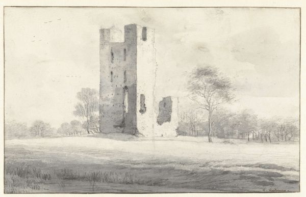 Editor: Here we have an ink drawing titled "Haughton Conquest: The Ruined House," created in the 19th century by an unknown British artist. It's quite haunting, really. What draws your eye, what do you make of it? Curator: It whispers of faded grandeur, doesn't it? I see the artist capturing not just a building, but the story of time itself. I wonder if it's a romanticized view of decay, perhaps hinting at the transience of earthly power. And that lone cow in the foreground—a subtle reminder that life goes on, even amidst ruin? Editor: The cow is such an interesting detail! I hadn't thought of it that way. Curator: Art's like that, isn't it? A conversation starter that keeps evolving with each new perspective. Editor: Definitely. I will keep this drawing in mind as I reflect on the passage of time and lost splendor.