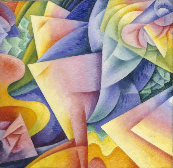 Gino Severini made this painting, Sea = Dancer, with oil on canvas; it’s this riot of fractured color, like the world exploded and then reformed as something new. Up close, you can see how the surface is built from tiny strokes, almost like he’s knitting with paint. This technique gives the painting this shimmery quality, as though the dancer and the sea are never quite still, always in motion. The colors aren't blended so much as juxtaposed, which makes them vibrate against each other. There’s this one dark blue, almost black, wedge shape, and it acts like an anchor for all the lighter, brighter colors. It’s like a shadow, hinting at something deeper, more mysterious beneath the surface. I'm reminded a bit of Kupka's paintings, with his interest in movement and abstract forms, but Severini brings a playful, almost chaotic energy to the canvas, something uniquely his own. Art is an exchange of ideas after all. In the end, Sea = Dancer, stays fluid, suggestive, resisting any single, fixed interpretation.