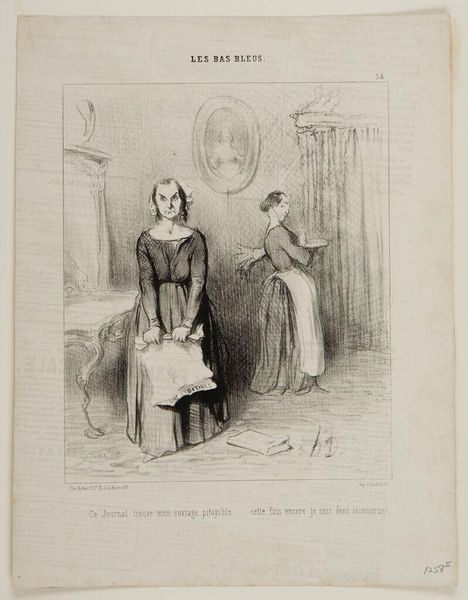 Editor: This is "So!... Here she is who... pours shoe polish in my hot chocolate!" by Honoré Daumier. I’m struck by the contrast between the man's dramatic pose and the woman's calm demeanor. What symbols or societal critiques do you see embedded in this scene? Curator: The “Bas Bleus” title, paired with the shoe polish, offers a powerful symbol. Consider that "Bas Bleus" mocks intellectual women. Daumier uses the shoe polish as a symbol of subversion, challenging expected gender roles. What's your understanding of that tension? Editor: So the woman's intellectual pursuits, represented by reading, are seen as a domestic transgression? Curator: Precisely! The "shoe polish" in his chocolate isn't literal, but an upset of the natural order. The cartoon satirizes the perceived threat of female intellectualism. Editor: That makes the image’s pointedness much clearer. Thanks for shedding light on the cultural context. Curator: Indeed. And it encourages us to reconsider visual imagery as a reflection of social anxieties.