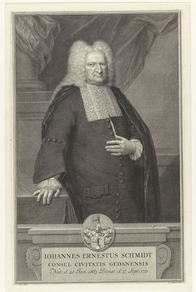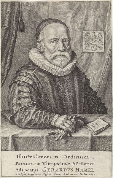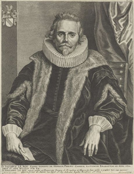 This is Jonas Suyderhoef’s portrait of Gillis de Glarges, created sometime between 1641 and 1682. The dominant visual experience is one of texture and depth, created through intricate lines and tonal variations, which evoke a sense of solemnity and introspection. Suyderhoef masterfully employs the contrast between light and shadow to model de Glarges' face, capturing a sense of weight and presence. The texture of the fur-lined coat and the delicate lace collar are rendered with remarkable detail. The formal composition, with its balanced arrangement of elements, reflects the subject's status and intellect. The overall structure can be interpreted through a semiotic lens, where the visual elements act as signifiers. The somber color palette may symbolize seriousness, while the precise lines and controlled composition suggest order and reason. These elements work together to construct meaning within the context of 17th-century Dutch society, where ideas of status, intellect and social responsibility were highly valued. The artist's technical skill in handling light and shadow serves a symbolic function, highlighting the complex interplay between outward appearance and inner character.