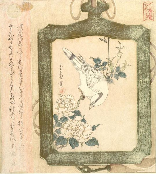 Editor: This is a woodblock print called "Sparrow and Magnolia" by Hokusai, currently residing in the Guimet Museum in Paris. It's very delicate and poised, isn’t it? What immediately strikes you about the piece? Curator: The spatial organization is intriguing. Observe how the composition distributes visual weight; the bird and floral arrangements counterbalance each other diagonally across the picture plane. This tension creates dynamism, preventing the image from feeling static. How do you perceive the role of line in defining these forms? Editor: Well, the lines are very crisp and defined, especially around the bird's feathers and the magnolia petals. They give everything a clear, almost graphic quality, wouldn't you say? Curator: Precisely. Notice the masterful use of line in creating texture and volume. The fine, varied strokes suggest the softness of feathers versus the smoother surfaces of the petals. Consider also the relationship between these lines and the areas of flat color. The unmodulated planes emphasize the artifice inherent in the print medium, foregrounding the constructed nature of representation. Editor: So, it’s not just about what we’re seeing, but how the artist is showing it to us through lines, shapes, and how they balance on the page? Curator: Exactly. It emphasizes the aesthetic structure rather than any overt narrative. Editor: That’s given me a new appreciation for what's happening with just lines and shapes! Thanks for pointing it out. Curator: A formalist approach opens paths into artworks like this one. It can bring you closer to the maker’s artistic vision.