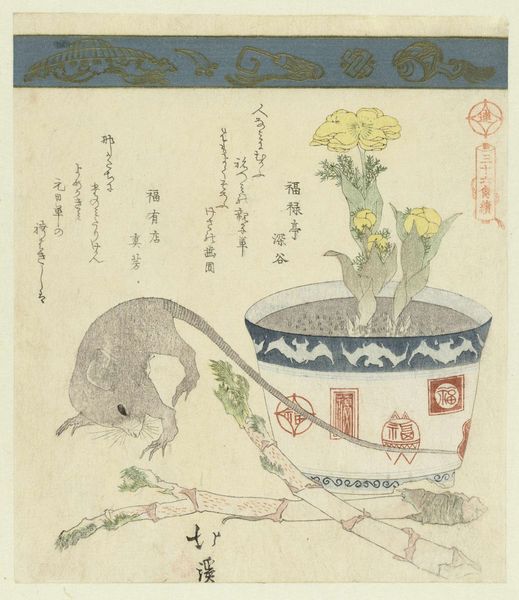 Chôtei Hisazumi created this woodblock print, Frog and Spray of Kerria Japonica, where we see a seemingly simple scene imbued with layers of meaning. At first glance, we see a frog, a symbol often associated with fertility and transformation, resting in a container. This isn't just any container, but one adorned with circular motifs resembling stylized chrysanthemums and geometric patterns. The chrysanthemum, a symbol of longevity and rejuvenation, whispers of cycles of life and death, reminding us of the ever-turning wheel of existence. Now, consider the frog itself. Across cultures, the frog bridges worlds: water and land, the conscious and unconscious. Like the Greek psyche, the frog undergoes metamorphosis, shedding its old form for the new, and mirroring our own potential for spiritual renewal. The presence of the Kerria Japonica with its vibrant yellow flowers adds another layer; a symbol of elegance and fleeting beauty. Together, these elements create a scene charged with emotional and psychological resonance, inviting us to reflect on the transient nature of life and the promise of rebirth.
