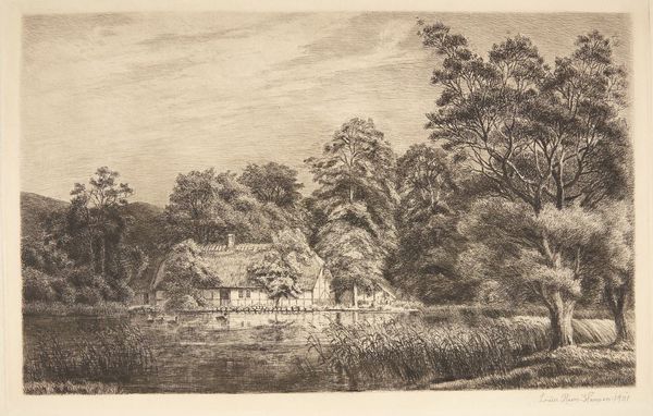 Editor: Here we have Louise Ravn-Hansen’s etching, "Mølledam," created around 1900 or 1901. It's currently housed at the SMK - Statens Museum for Kunst. I find the monochromatic rendering of the textures so compelling; the way the light reflects on the water and foliage. How do you interpret the composition and tonal range within this landscape? Curator: Formally, observe the strategic use of line. Ravn-Hansen employs densely hatched lines to build up tonal depth, particularly in the foliage, creating a rich tapestry of textures. Note the contrast: the smoothness of the sky, achieved through minimal etching, against the complexity of the trees and the thatched roof of the cottage. What structural elements do you discern that dictate the organization of this piece? Editor: The cottage itself seems to act as a focal point, doesn't it? But the trees definitely dominate the frame. The eye seems drawn toward the building first, then fans out across the trees...and then back around again through the water. Curator: Precisely. The cottage functions as an anchor, yes. Now, consider the foreground. How do the reeds in the water impact the overall depth and spatial relationships within the composition? Notice how the light glints. Editor: They appear to be both framing device and reflection of forms of the upper visual registers. The subtle shifts in the reeds and water surfaces seem like studies in light itself. They draw the viewers’ eyes, while echoing in their tones and structures forms above. It feels cohesive, in a quiet way. Curator: Indeed. The repetition and variation create a visual rhythm, and unity of the whole. It emphasizes a controlled formal approach to landscape. What have we learned? Editor: To observe more and infer from construction...and how rewarding! I will think of this whenever visiting landscape art from now on.