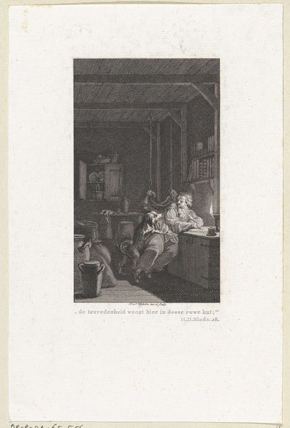 This engraving by Reinier Vinkeles captures a domestic scene, rendering it with lines on paper. The open window, a classic Renaissance motif, dominates the composition. It's not merely a source of light. Consider its symbolic weight: for centuries, the window has represented perspective, a gateway between the interior world of the home and the vast exterior, a liminal space connecting the known with the unknown. Recall the Arnolfini Portrait by Jan van Eyck, where the window similarly frames a moment of profound human connection. Here, however, the man gazes out, almost yearningly, while the woman cradles the child, anchoring the scene with maternal warmth. The window, therefore, becomes a conduit for both aspiration and the grounding force of family, reflecting the complex interplay between individual desire and domestic responsibility, a tension that echoes across generations. The image evokes the continuous cycle of life and longing.