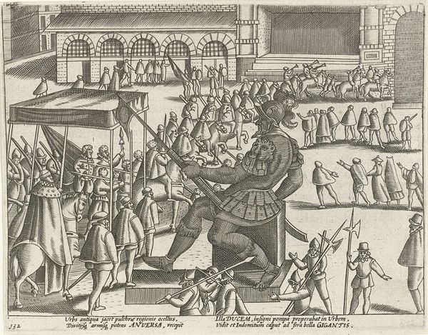 This engraving depicts the gruesome aftermath of the assassination attempt on Prince William of Orange in 1582. Made by an anonymous artist, it captures the public humiliation of Jean de Jauregui, the would-be assassin. The print offers a window into the religious and political strife of the 16th century, when the Netherlands was under Spanish rule and deeply divided between Catholics and Protestants. Jauregui, a Catholic, was motivated by religious zeal to kill Prince William, a key figure in the Dutch revolt against Spanish oppression. The stark imagery of Jauregui's body being paraded through the streets speaks volumes about the era's brutal methods of justice. The act of displaying the body serves as a warning to others who might challenge Spanish authority. It's a chilling reminder of the human cost of political and religious conflict, and the ways in which power is maintained through violence and intimidation.