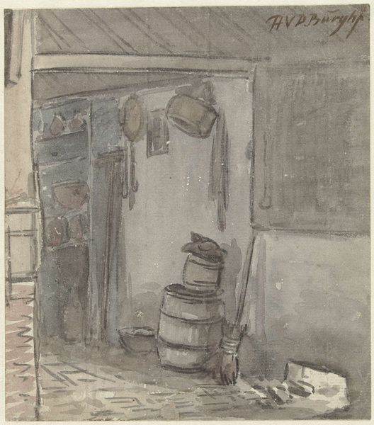 This drawing, by Georg Melchior Kraus, is rendered in pen and brown ink with grey wash, a common technique at the time. The application of the wash softens the architecture of the farmhouse, emphasizing the interior setting. The material of the drawing itself becomes a lens through which we observe the daily life inside. Looking closely, you can almost smell the aged wood of the staircase, the woven texture of the baskets, and the sturdy form of the barrel in the foreground. Kraus’s work draws attention to these mundane objects and the ways they create a context for the girl. Consider the labor embedded in each element: the trees felled and milled into planks, the reeds gathered and shaped into baskets, the barrel coopered, and the drawing rendered. All these things speak to the quiet rhythms of pre-industrial life. By appreciating the making, we recognize the inherent value and care interwoven into the most humble of objects.