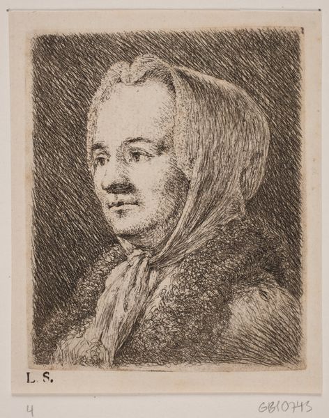 Joseph Brecheisen created this small portrait, "Brystbillede af en midaldrende Mand" using etching techniques, though the exact date remains unknown. Brecheisen was active during a period marked by rigid social hierarchies, which influenced artistic representation and patronage. The sitter’s gaze evokes introspection. His clothing implies a certain social standing, yet the etching's intimate scale suggests a personal, rather than official, representation. The detailed lines capture the textures of his turban and cloak, drawing viewers into his world. How does this image resonate with our contemporary understanding of identity and representation, and what does it reveal about the relationship between artist and sitter?