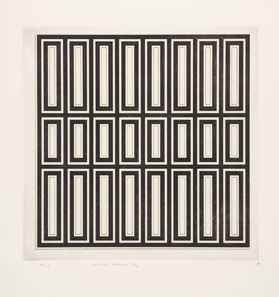This untitled work is by Victor Vasarely, an artist known for his pioneering role in Op Art. It's made with a limited palette, and yet, the composition resonates with dynamism. The artwork presents a structured arrangement of black geometric shapes, primarily circles and squares, against a white background. Each form seems meticulously placed, creating a visual rhythm that pulsates across the surface. The stark contrast between black and white enhances the perception of depth and movement, compelling our eyes to oscillate between figure and ground. Vasarely's work challenges our perception, engaging with ideas of Gestalt psychology, where the whole is greater than the sum of its parts. It destabilizes fixed meanings by prompting continuous visual reevaluation. The structured, yet visually dynamic arrangement reflects the artist's interest in how abstract forms can evoke sensations of movement. Consider how the repetitive, yet varied use of geometric forms invites ongoing interpretation. Art, in this sense, becomes a site of perceptual play, continuously redefined by our gaze.