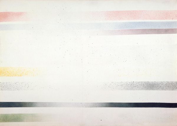 Curator: Looking at this, I feel an immediate sense of lightness and… well, almost joy. The colours, the spaciousness…it's uplifting, isn't it? Editor: Indeed. We're looking at Morris Louis's "Alpha-Pi," created in 1960. Louis was a key figure in the Color Field painting movement. Notice how the unprimed canvas plays such a vital role. Curator: Absolutely, that raw canvas is just as important as the pigments he used. He seems to be celebrating the very materiality of the medium. Reminds me of someone removing their shoes just to feel the earth. Editor: The staining technique he employed was quite radical for the time. He poured diluted acrylic paint onto the canvas, allowing the colours to soak directly into the fabric. There's no impasto, no brushstrokes. It's almost anti-painterly. And you can see echoes of Jackson Pollock, maybe even Helen Frankenthaler. What do you think about these artistic influences? Curator: Influences are undeniable, sure, but for me Louis takes it somewhere else. There's such control here, such restraint in a sense. Each colour interacts with the raw canvas almost…democratically, like each one has a specific reason to be there, even if we can’t immediately identify those reasons. Editor: Fascinating. Art critics positioned Louis’s works, and Color Field painting in general, within Clement Greenberg's formalist agenda, prioritizing flatness and opticality over narrative or social commentary. Was this pure painting a turn inward at a pivotal point of social turbulence? Curator: You know, when I look at the pristine white space it doesn't necessarily feel disconnected. Maybe it's a blank slate, a space of possibility opened up through a colourful, energetic yet self-contained expression. Editor: It's intriguing how the "nothingness" becomes so vital in that formulation. Thanks for your time today! Curator: Anytime! Always a pleasure to share reflections and, ideally, to invite new interpretations, new dialogues with such pieces.