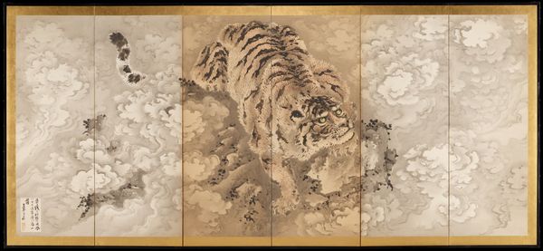 Curator: Let's take a look at this work, dating roughly from 1735 to 1765, simply titled, *Tiger.* It's a hanging scroll using ink and color on paper, and we attribute it to the artist Yūhi. Editor: My first thought is those startling blue eyes. It feels almost playful, rather than fierce, doesn't it? The pose is so…contained. Curator: Well, in Japanese art, the tiger is often a symbol of power, courage, and protection. It's tied to specific astrological periods too, taking on all that symbolic weight. Notice how Yūhi has rendered the stripes – they almost feel calligraphic, don’t they? Not just descriptive, but carrying a certain energy. Editor: I agree. The stripes feel… almost like brushstrokes of intention. It reminds me of how a composer might arrange notes – each stripe contributing to the overall feeling, which, to me, is more about alertness than aggression. Plus, those paws! They’re enormous and quite detailed. Curator: Tigers were powerful symbols for warriors and samurai, representing strength, loyalty, and fearlessness. These were all important in society, which projected these associations onto images such as this one. Editor: Perhaps that alertness comes from being vigilant and aware in that context. It is an arresting image. The expression almost teeters between wise contemplation and cartoonish surprise. Maybe it has simply seen something just off to the left we cannot. Curator: The ambiguity is definitely part of its charm. The artist blends observation and cultural meaning in a compelling way. It makes one think about what characteristics we assign to animals and why. Editor: Precisely! Are we seeing the tiger, or our projections about it? Or about ourselves? I like it when art gets me wondering in that way.