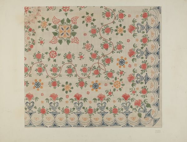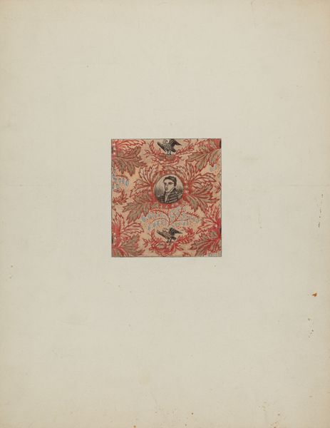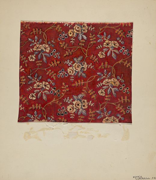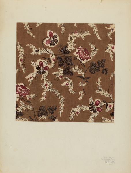Editor: So this textile piece, titled “Printed Textile,” by Ralph M. Lewis, created around 1938… it has this sort of comforting, vintage feel, almost like something you'd see in your grandmother’s house. There’s something about those faded floral patterns. As someone interested in the language of images, what readings does this textile pattern suggest to you? Curator: Well, immediately, I'm drawn to the brown roses—the very symbol of remembrance and appreciation. Consider the repetitive motif alongside those dashed marks. Are they raindrops? Are they meant to fill what could otherwise be read as emptiness? The choice of colors definitely invokes nostalgia, echoing simpler times perhaps, yet simplicity in art doesn't always denote a simple message. The textile appears as a cultural artefact preserving emotional states about place and time. Editor: Interesting. I hadn't considered the potential emptiness or longing within what I saw as just a pattern. The "raindrops," as you called them, scattered around the roses now suggest an intentional, less cheerful motif than just sweet, faded florals. Curator: Absolutely. Every mark, every color holds potential meaning layered with the past and informed by social constructs. Are there other details you noticed? Does the artist's specific approach to printmaking hold importance? Or his inclusion of an asymmetrical central piece? It seems intentionally disruptive among a regulated pattern. Editor: Now that you mention it, I see those tensions, that asymmetry. I had initially dismissed the image as a mere floral design but now I see it's charged with meaning beyond surface aesthetics. Curator: Indeed, every symbol and design has weight, and by examining the imagery through an iconographic lens, it exposes its cultural story. Editor: I will definitely be keeping an eye out for these "visual stories" moving forward. Thanks for enlightening me.