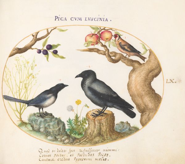 Editor: This is "Plate 17: White Heron(?) and Black Stork Killing a Snake with a Dragon's Blood Tree," a watercolor drawing from around 1575-1580 by Joris Hoefnagel. The composition feels so deliberately symbolic; I'm really struck by that bizarre detail of the tree appearing to 'bleed' from a sword wound. What leaps out at you when you look at this work? Curator: Oh, where to begin? For me, it’s the utter strangeness of it all! The clinical yet fantastical observation…it feels like stepping into a dream dreamt by a very learned, slightly eccentric scholar. Those precisely rendered birds…they're like characters in a fable, aren't they? And the so-called Dragon’s Blood Tree, impaled, as you pointed out. It’s gruesome but utterly captivating, no? Do you think Hoefnagel intended to suggest some deeper allegorical meaning? Editor: It definitely feels deliberate. The blood aspect of the tree perhaps refers to alchemical processes? The dueling birds create further ambiguity; each has opposing connotations. What is Hoefnagel communicating through these dichotomies? Curator: Ah, there you go! Exactly! Alchemy, perhaps morality, even politics, given the era. Or maybe it’s just pure playful intellectual curiosity, a visual riddle for his contemporaries. Isn’t that thrilling? To consider the myriad possibilities swirling beneath the surface of a seemingly simple image? These are questions, not declarations, of course. The charm is in their resistance to easy answers. I feel utterly tickled pink when I think of someone pausing before this piece in 500 years’ time and thinking along the very same lines! It tickles your fancy, doesn’t it? Editor: It absolutely does! I didn't expect to get so lost in pondering one small tree, two birds, and a snake. It speaks to the capacity of art to hold infinite meaning, even when so economical with symbolic representation.