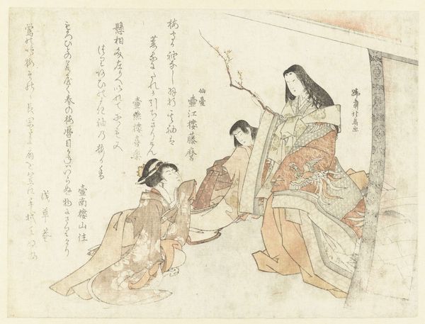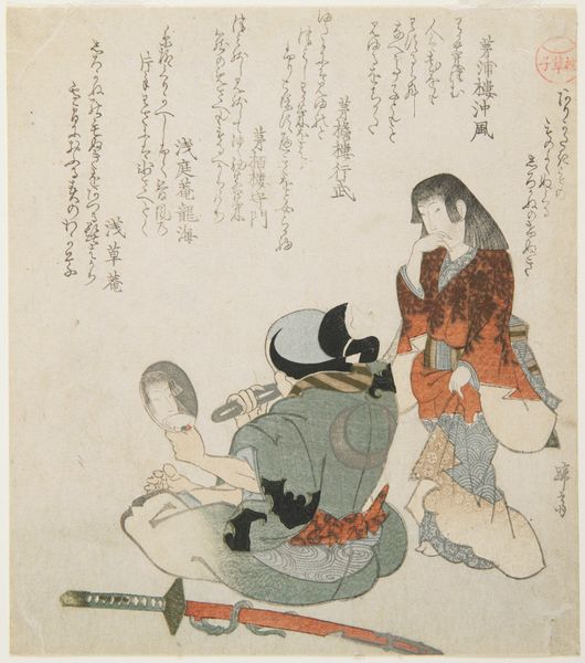 This woodblock print was made by Hishikawa Sōri in Japan during the Edo period. The image depicts a woman playfully teasing a young boy with a fan. These images of daily life were a new art form for urban audiences. Woodblock prints served as a form of mass media, popular among the rising merchant class. The Edo period saw a shift in social dynamics with merchants gaining economic power, which influenced cultural trends. These artworks provide us with a glimpse into the social customs, fashion, and leisure activities of the time. The print also includes calligraphy, which adds another layer of meaning and cultural context. To gain a deeper understanding, we might consult historical texts, literature, and social commentaries from the Edo period. Understanding art means understanding its place in the world.
