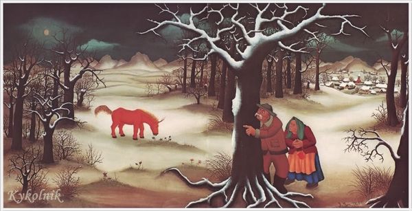 Ivan Generalic's "Winter Day" is a painting probably made with oil on canvas, though it has a smooth, almost slick feel. The color palette is amazing; it feels like a dream, all these reds, greens, and browns that create a sense of depth in this painting. I can see all the labor that went into creating this world. Look closely at the trees in the background, they are like a repetition of brushstrokes, like a meditation. The marks repeat over and over. It’s the kind of touch that reminds me of the work of Henri Rousseau. The perspective is so flat, like looking at a medieval tapestry or a landscape by Grandma Moses. It's charming and a bit unsettling, like a memory trying to surface. "Winter Day" reminds us that painting can be a way of seeing, of constructing our own realities, one brushstroke at a time.