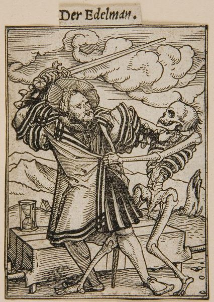 Curator: Look at this piece, "The Old Man" by Hans Holbein the Younger. I'm immediately drawn to the stark contrast, the raw depiction of mortality. Editor: Indeed, the composition is unsettling, yet effective. I find myself pondering the materials—the woodblock's influence on the linework. What sort of tools were used? How did the printing process impact its circulation? Curator: The cross-hatching technique certainly enhances the emotional impact. The textures give volume to the old man's robes, the skeletal figure's bony structure. Editor: Absolutely. I wonder about the original cultural context: the role of printmaking in disseminating such imagery. How did these images serve as commentary on class, power, and mortality? Curator: For me, Holbein’s artistic choices heighten the drama. That stooped figure, with death literally breathing down his neck... Editor: Reflecting on it, my focus returns to its production. How labor and materials shape our understanding, and how art acts as both a mirror and maker of society.