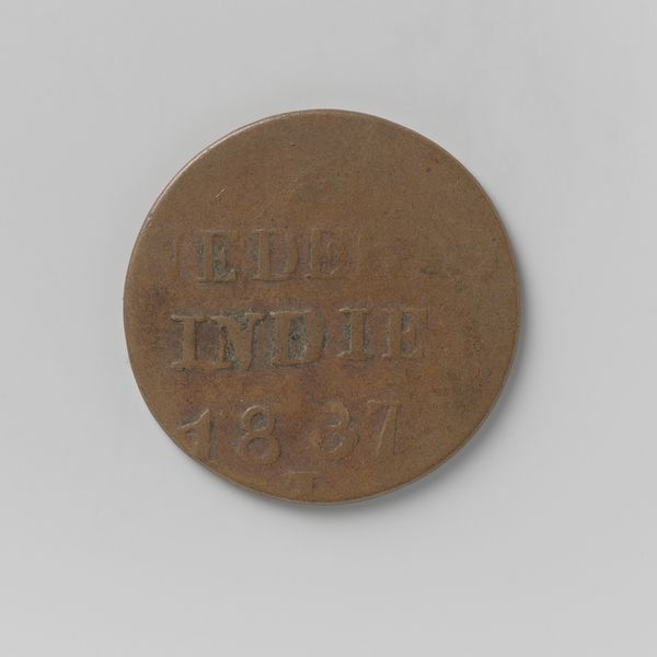 This is a copper coin minted in 1839 under the authority of King Willem I for use in the Dutch East Indies. Its circular form, standardized weight, and inscription offer a glimpse into the formal structures of colonial administration. Consider the ordering of elements: the text is stacked neatly in horizontal lines, proclaiming "NEDERL. INDIË" and the year of its creation. This reflects a desire for legibility and control. The material itself—copper—speaks to the intersection of value and power, as the coin symbolizes the economic reach of the Dutch empire. Despite its small size, the coin functions as a potent signifier. It's an intersection of text, symbol, and value within a carefully structured system. It's a reminder that even the most mundane objects are embedded with layers of meaning.