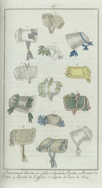This is a page from the journal Elegantia, dating from January 1807, presenting designs for women's hats. The anonymous artist employs a structured layout, organizing the hat designs in neat rows and columns, suggesting a taxonomy of fashionable forms. Each hat is delineated with fine lines and subtle washes of color, emphasizing shape and texture. The velvety textures and satin trims are evoked through delicate shading, conveying the opulence and refinement sought by the fashion-conscious consumer. The composition invites a reading akin to semiotics; each hat becomes a signifier, communicating social status and taste. The variations in shape, embellishments, and color act as codes, denoting specific meanings within the cultural context of early 19th-century fashion. The artist meticulously details the elements, creating a visual language through which the consumer could decode and adopt the latest trends, reinforcing how fashion becomes a system of signs to negotiate identity and social position.