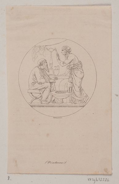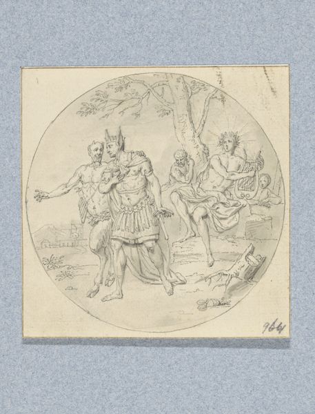 Curator: Looking at this pencil and pen drawing, titled "Aankomende militair geeft een zittende man een hand (in doos met 43 tekeningen)," created by Louis Fabritius Dubourg in 1743 and held at the Rijksmuseum, the delicate linework gives the scene an almost dreamlike quality. The moment depicted, a soldier shaking hands with a seated man, is full of potential narratives. Editor: It strikes me as a moment of transition, pregnant with sociopolitical significance. Given the artist’s influences from neoclassicism and Greek and Roman art, how might this simple act of handshaking signify something larger about 18th-century power dynamics or the shifting nature of warfare and leadership at the time? Curator: Well, examining the materiality first, the choice of pen and pencil suggests both precision and a cost-effective means of production, indicative perhaps of its purpose as preparatory work. The circular composition might point us towards the artist's involvement in design work destined for coins or medals. Think of it as the craft inherent in the social reproduction of military status through imagery. Editor: Absolutely. We see in that composition not just an embrace of neoclassical ideals, but a specific historical context shaping the work. The themes of heroism, duty, and the negotiations of power within military and social hierarchies resonate profoundly. That's definitely present in the formal structure. The figure is the hero in Roman gear so how does this fit into historical precedents for visualizing male authority? Curator: It appears more about a contractual negotiation rather than some show of power, it’s a business transaction rendered in classically inspired form. How might such visual messaging about entering the military be deployed? What sort of access to materials was afforded? Editor: We should also consider how images like this potentially reflect and reinforce cultural narratives of masculinity, leadership, and the social order of the 18th century. I can see how this drawing is part of a larger visual language justifying state-sanctioned violence, gender norms, and hierarchies of power and privilege. Curator: All persuasive functions and potentially open for reinterpretation with shifts in the access to means of both production and distribution of new artistic practices. Thank you, Louis Fabritius Dubourg. Editor: Precisely, that act of a military candidate sealing an accord remains relevant when the dynamics of the deal are unpacked and understood through the social relations that underpin it. Thank you.