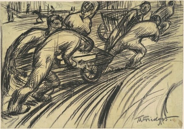 Curator: Lovis Corinth, born in 1858, captured this "Wild Dancing Scene" in an etching, now residing at the Harvard Art Museums. The energy practically jumps off the sheet. What strikes you first about it? Editor: Rawness. The frantic energy, the scratching of the plate, it's all right there. You feel the labor, the quick, impulsive marks— almost like a study in movement using only line. Curator: Exactly. Corinth was working within a tradition of German Expressionism, but he’s injecting a frenetic modern sensibility. The lack of clear form challenges conventional representations of dance. Editor: And the printmaking medium itself—etching—emphasizes the immediacy, the artist's hand. It democratizes the image, making it more accessible than a unique painting. Curator: Yes, prints allowed for wider dissemination of imagery and ideas. Corinth leveraged that to engage a broader public. Editor: This piece really makes you think about how materials and process influence the reception, doesn't it? It's not just *what* is depicted, but *how*. Curator: Indeed, the medium shaped both its message and its audience. A compelling reminder of art’s multifaceted role. Editor: I agree. It's a fascinating look at art, production, and its cultural impact.