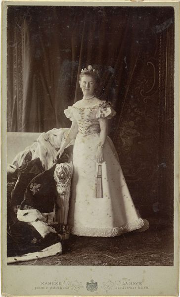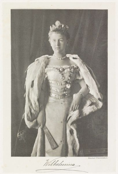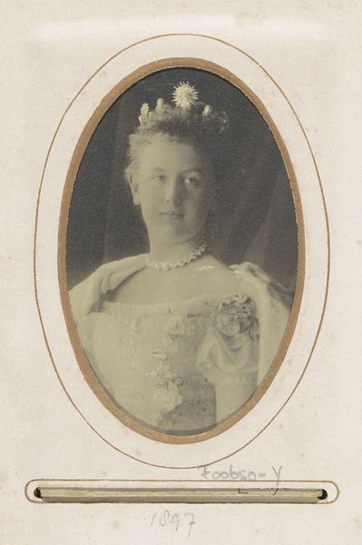Editor: This gelatin silver print, "Portret van Wilhelmina, koningin der Nederlanden" by Richard Kameke, dates from 1898. It has an ethereal quality. How do you interpret this work, especially considering its materiality? Curator: Well, a gelatin silver print produced in 1898 situates this portrait firmly within a moment of technological development. This photograph wasn't just about capturing the Queen's image, it was about using new industrial processes to disseminate it widely. We need to think about who had access to these images and how the mass production of such photographs shaped public perception of royalty. What kind of labor was involved in the photographic production and its distribution, compared to say, oil paintings? Editor: That’s fascinating! So, it's less about Wilhelmina herself and more about how photography democratized portraiture? Curator: Exactly. The material and its accessibility change the dynamics of power and representation. Before photography, such portraits were limited to the upper classes. Now, ordinary citizens could possess and consume the image of their Queen. Editor: I see, the process transforms what the image means. The mass production using gelatin silver creates the meaning just as much as her posed representation. It is fascinating to consider how photography transformed not only artistic production but also social structures and accessibility to powerful icons! Curator: Precisely, and that changes our relationship to her as a public figure. The photographic medium's proliferation democratizes power in intriguing ways by increasing her likeness.