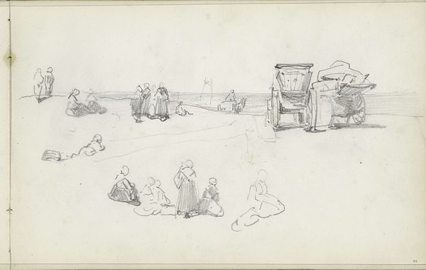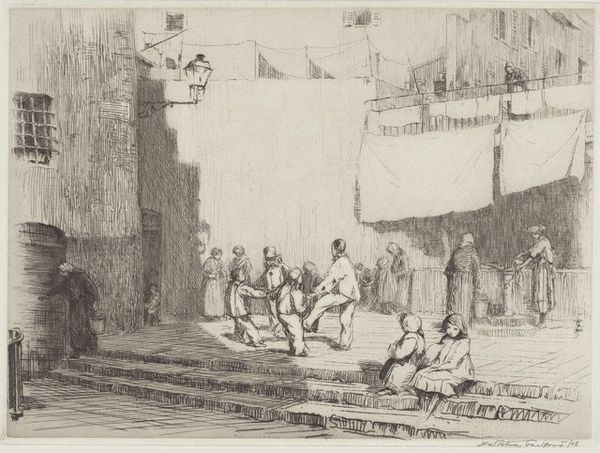 Editor: So, this is James McBey's "Fishmarket," from around 1913, created using pen and ink. It's a pretty straightforward depiction of a market scene. It has an almost ethnographic feel. How do you interpret this work, especially considering its date? Curator: The "ethnographic feel" you identify is crucial. Given its creation around 1913, we need to view this piece through the lens of Orientalism, a Western perspective that often exoticized and essentialized non-Western cultures. The quick sketch captures the ‘Oriental’ city as a place of busy commerce. Do you think the artist's choice of medium, the quick pen sketch, reinforces or challenges this potential objectification? Editor: That’s a good point. The sketch-like quality does feel… detached, somehow. It’s like he’s quickly capturing an exotic scene rather than engaging deeply with it. Is the focus just on commerce important, ignoring other nuances? Curator: Precisely. We should examine how the artist positions himself in relation to his subject. Where does he stand, culturally and socially, and how does that impact his depiction? Notice the absence of individual detail in the figures. This flattening reinforces stereotypes and power dynamics inherent in Orientalist portrayals. It’s an exercise of power isn't it, a claiming of a place by depiction? Editor: It's making me think about who this artwork was *for*. Was it meant to inform or to titillate? Was McBey actively perpetuating stereotypes, or simply working within the visual language of his time? Curator: These are excellent questions. Considering the work in its historical context allows us to understand not only the artist's intentions, conscious or unconscious, but also the broader societal attitudes towards "the other." The prevalence of this gaze speaks volumes about the imbalance of power at the time. Editor: So, what starts as what seems like a straightforward street scene is actually loaded with complex social and political meaning! Curator: Exactly! By engaging with the artwork through intersectional lenses, like Orientalism and power dynamics, we unlock a deeper understanding of its significance and its legacy. The rapid pen strokes speak volumes, if you let them.