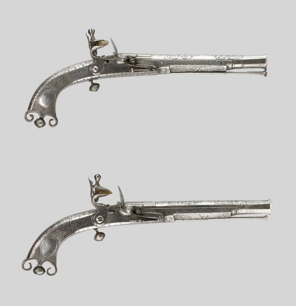 Curator: Right, let’s take a closer look at this intriguing object. It's a candle snuffer, or *Kaarsensnuiter*, crafted by Abraham van der Hoeff sometime between 1704 and 1734. It's made of silver, and exemplifies decorative arts of the Baroque period. Editor: It's utterly charming! There’s something quite captivating about seeing such careful artistry applied to an everyday tool. And the way it reflects light, it seems almost too elegant to be used. Curator: The level of detail is certainly remarkable. When you consider the labour involved in crafting something like this out of silver, from the initial extraction and refining of the material to the fashioning of such delicate scrollwork and the miniature receptacle— Editor: A receptacle that I just have to imagine filled with the ashy remains of countless snuffed candles! It’s morbidly delightful, like a little silver coffin for spent candle wicks. All this Baroque ornamentation on such a fundamentally utilitarian thing. Curator: Exactly! That’s where its interest lies, in the combination of practical function and ornamental design. The production of silver objects during this era was very dependent on access to resources, skilled labour, and patronage networks. This object tells a story about Dutch affluence, and how labour was structured in that period. Editor: You're right. There's something about the contrast between the shimmering silver and its intended function that really sparks the imagination. Makes you wonder about the lives of the people who once used it, the rooms they lit, the stories told by candlelight... Curator: And of the artisans, the silver smiths and metalworkers, the systems of production... we often forget the materiality behind objects. This piece reminds us of the global networks that facilitated even mundane moments, in history. Editor: It does highlight how everyday life and artistry are much closer linked than we sometimes remember. I look at it now, it seems a lot more than an ornate tool... Curator: Precisely, it's a confluence of labour, style and history, a little microcosm from the Baroque period captured in gleaming silver. Editor: Well, I think I'll forever look at mundane tools differently now. Thank you for that!
